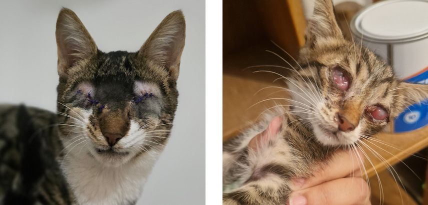 Sid was found at one of the cat colonies we spay, neuter and feed by an army camp on the 1st of October when he was approximately two months old. Despite being completely blind Sid was surprisingly carefree living as a part of the colony, but we couldn't of course leave him on the streets alone with no vision. Now six months old Sid is still that carefree, brave and affectionate boy and would likely enjoy leash walks as well. He will come to Finland and straight to his home or to foster care in Kerava neutered, dewormed, vaccinated and tested negative for FIV and FeLV on the 24th of February. Can be adopted to befriend another cat or with another one of our organization's cats.