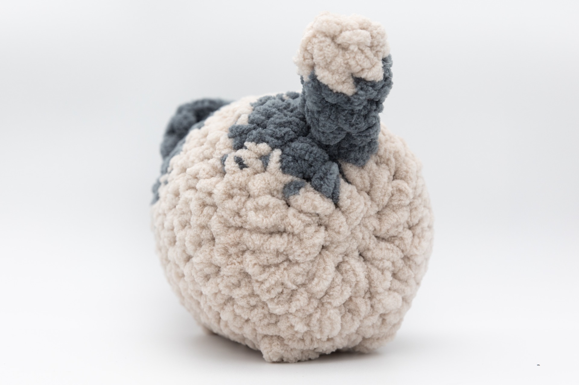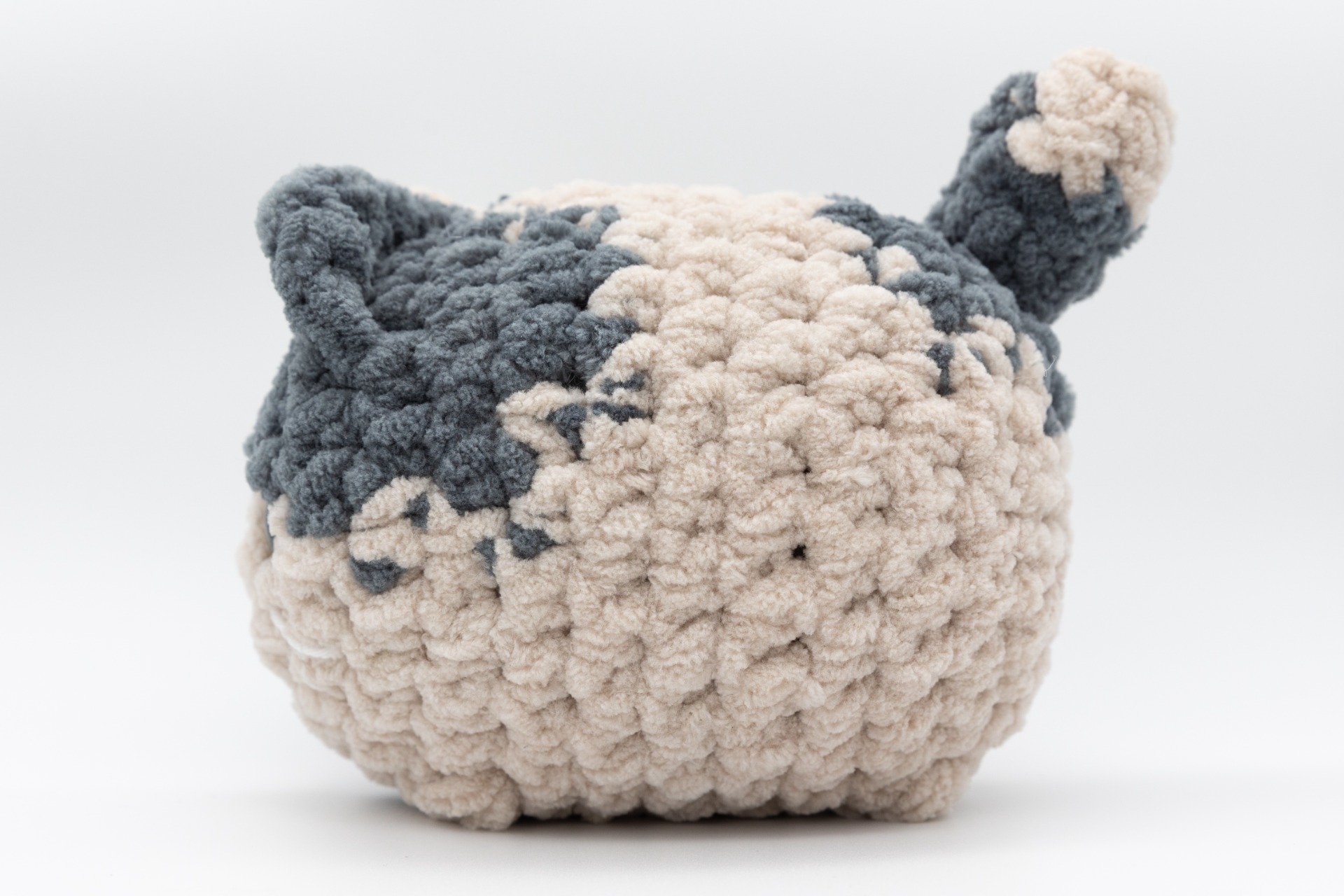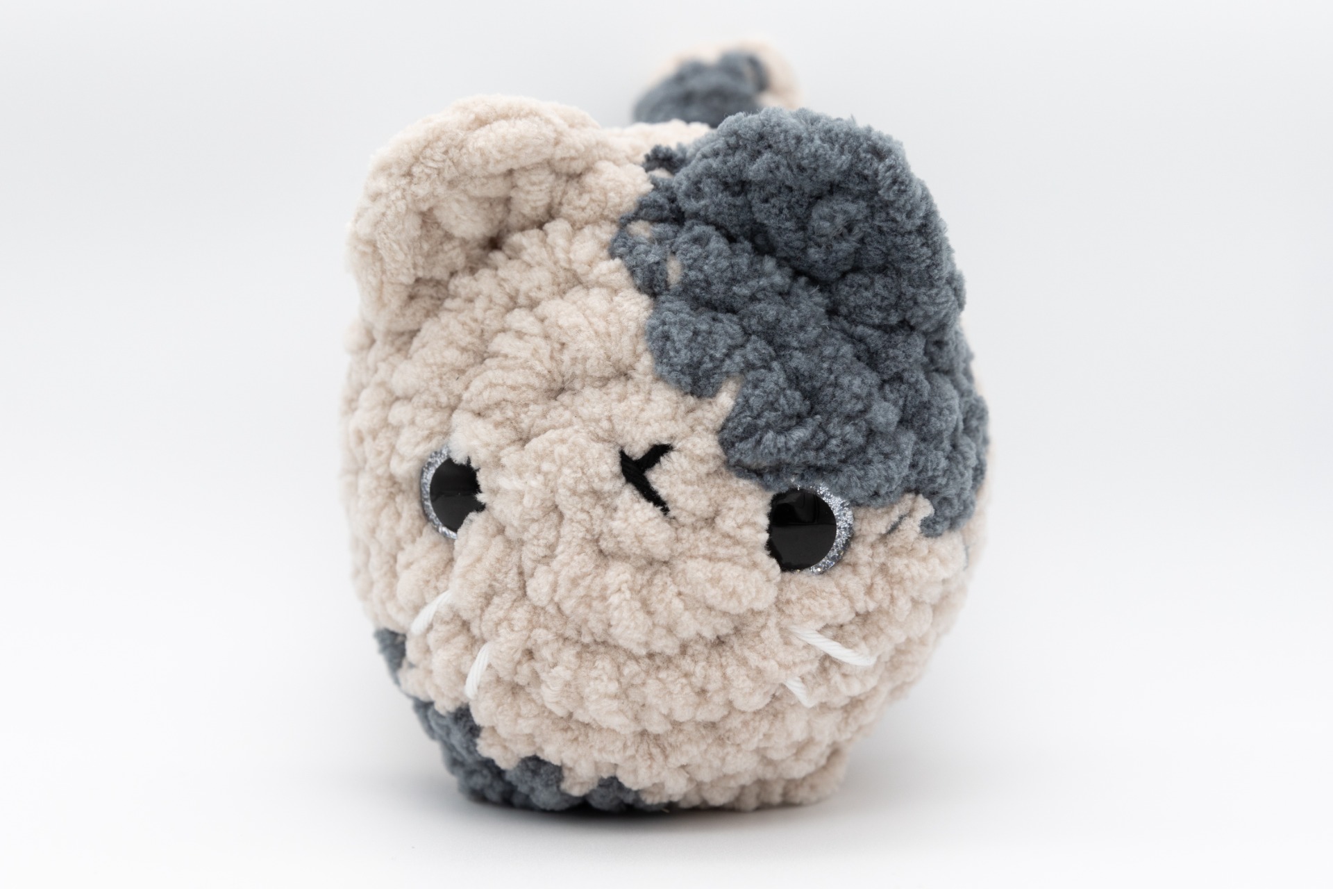 Completely vegan cat plushie crocheted from soft micropolyester yarn, pattern by Annie Carraway. Tightly attached safety eyes and details secured with knots on the inside. Filled with cotton wool.
