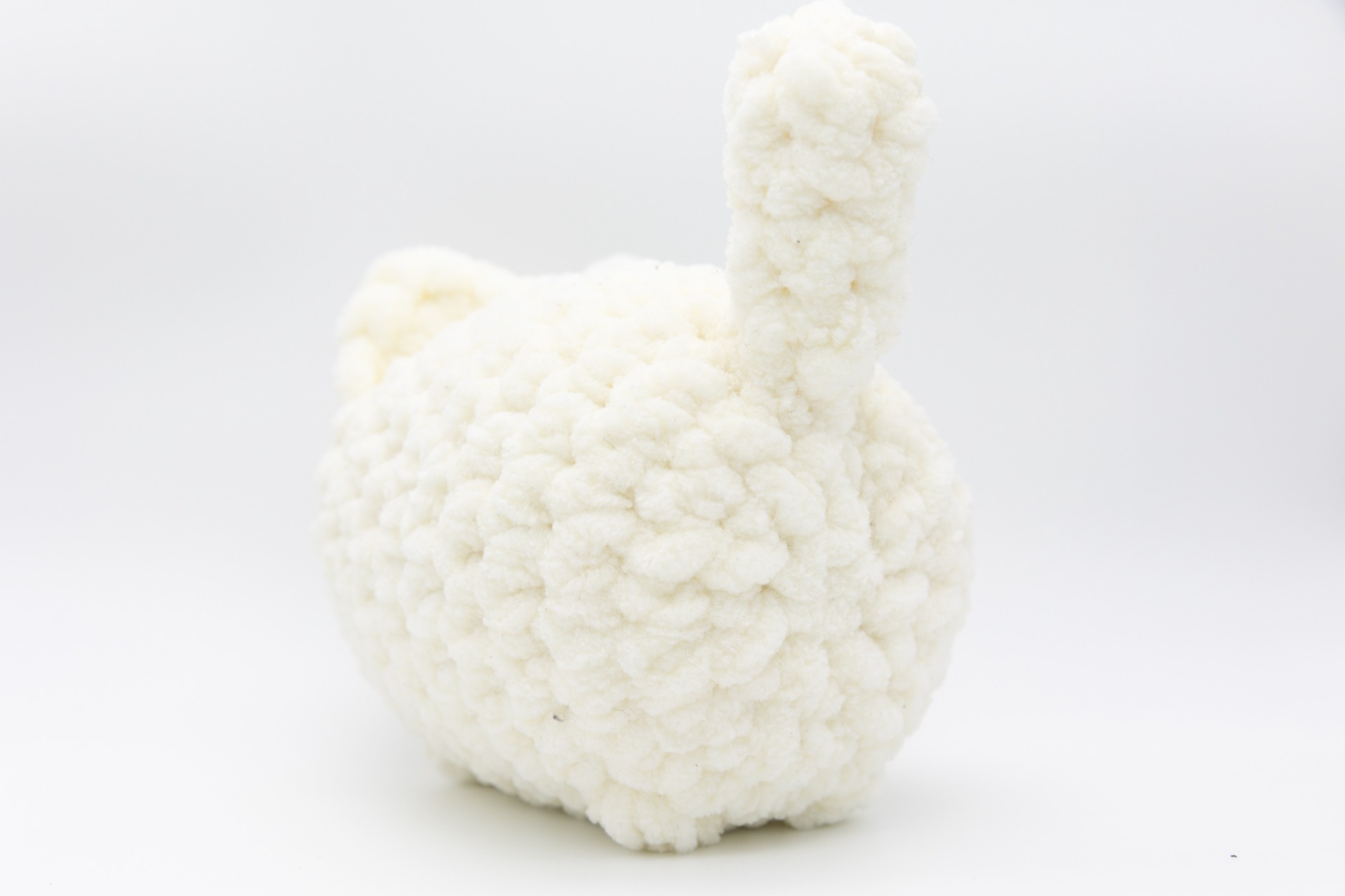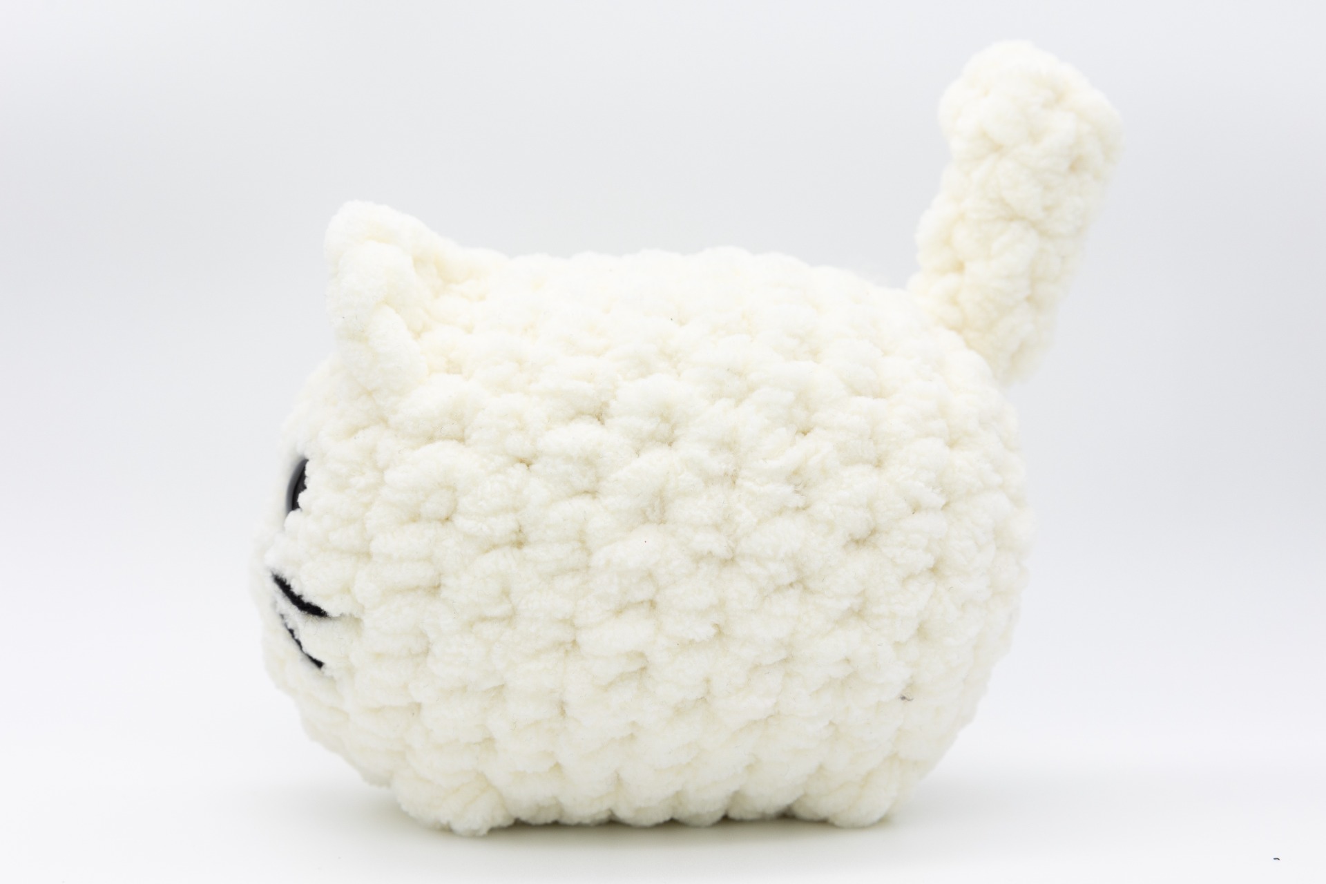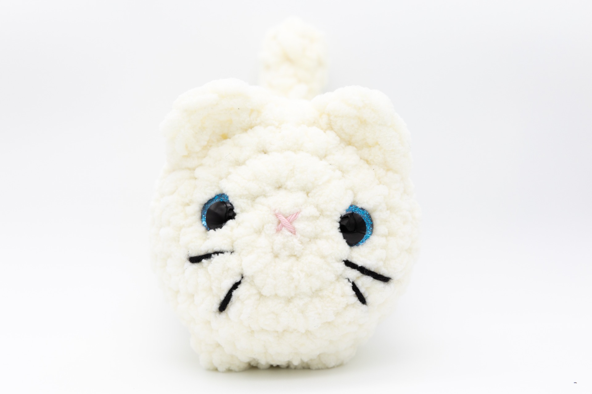 Completely vegan cat plushie crocheted from soft micropolyester yarn, pattern by Annie Carraway. Tightly attached safety eyes and details secured with knots on the inside. Filled with cotton wool.