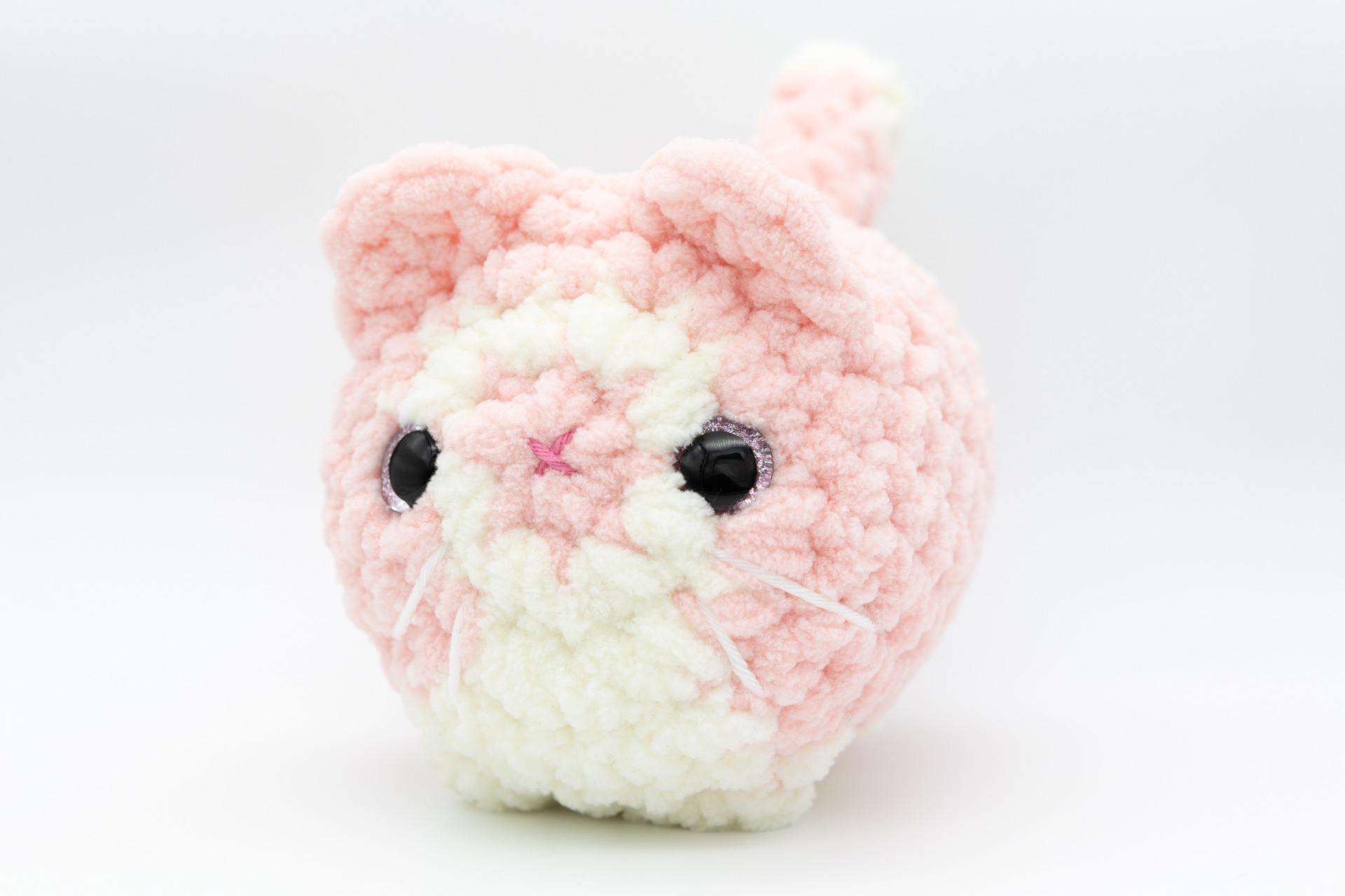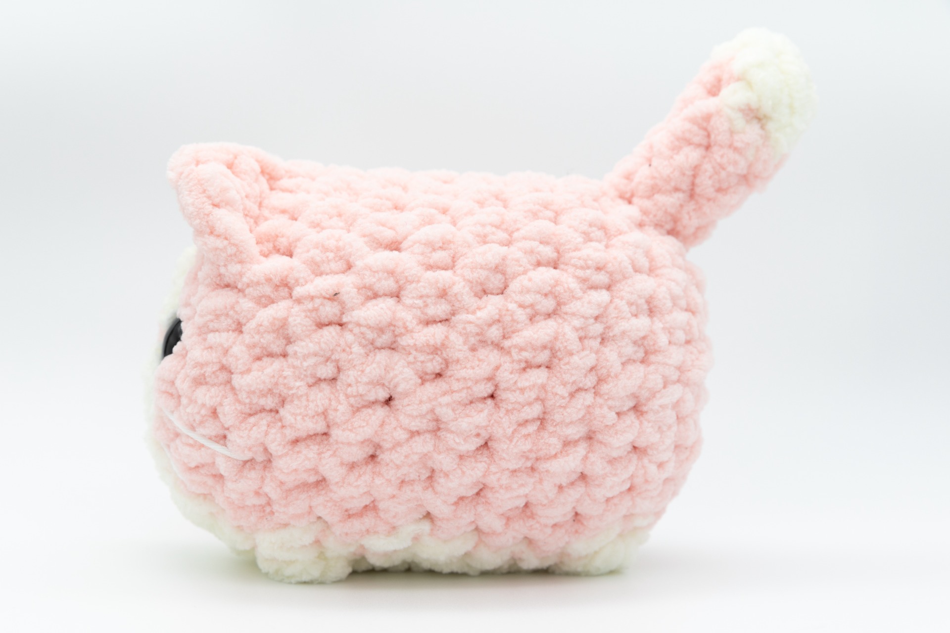 Completely vegan cat plushie crocheted from soft micropolyester yarn, pattern by Annie Carraway. Tightly attached safety eyes and details secured with knots on the inside. Filled with cotton wool.