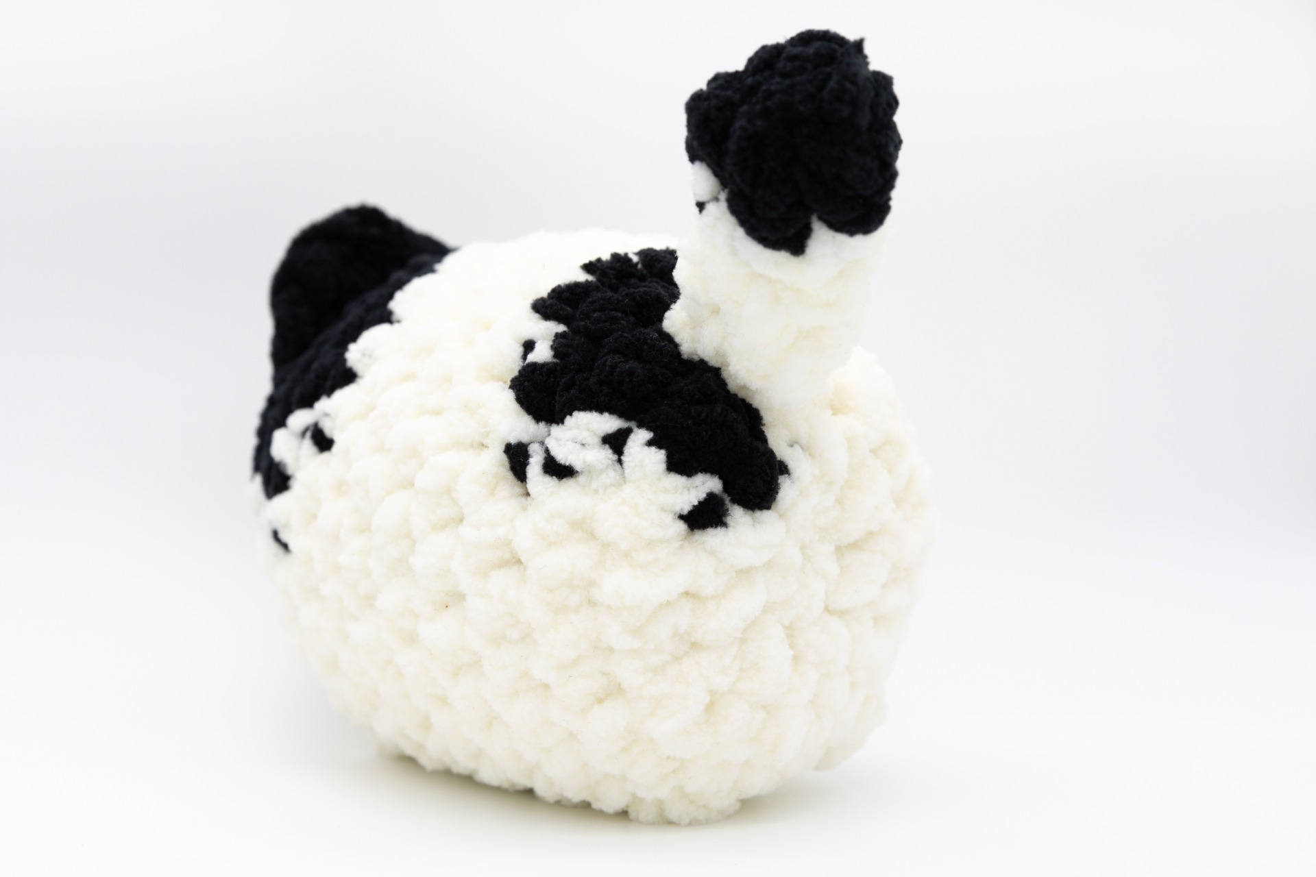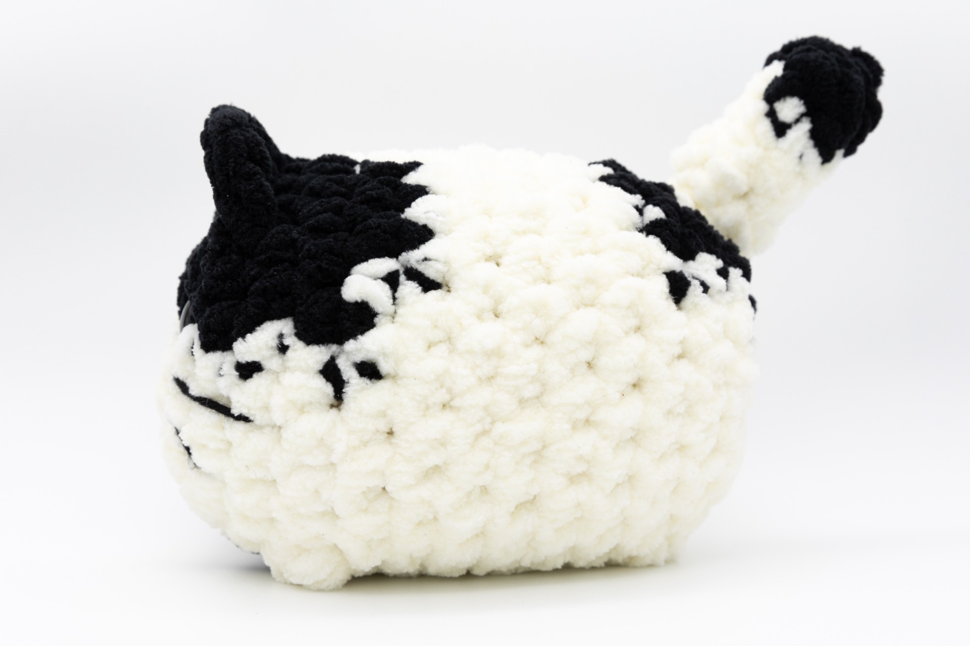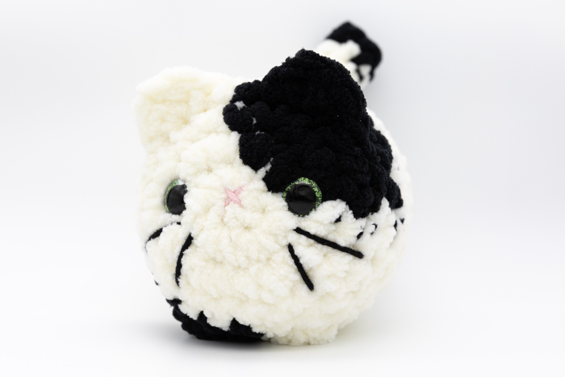 Completely vegan cat plushie crocheted from soft micropolyester yarn, pattern by Annie Carraway. Tightly attached safety eyes and details secured with knots on the inside. Filled with cotton wool.