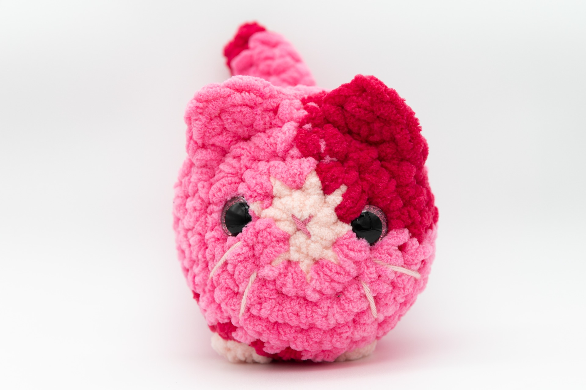 Completely vegan cat plushie crocheted from soft micropolyester yarn, pattern by Annie Carraway. Tightly attached safety eyes and details secured with knots on the inside. Filled with cotton wool.