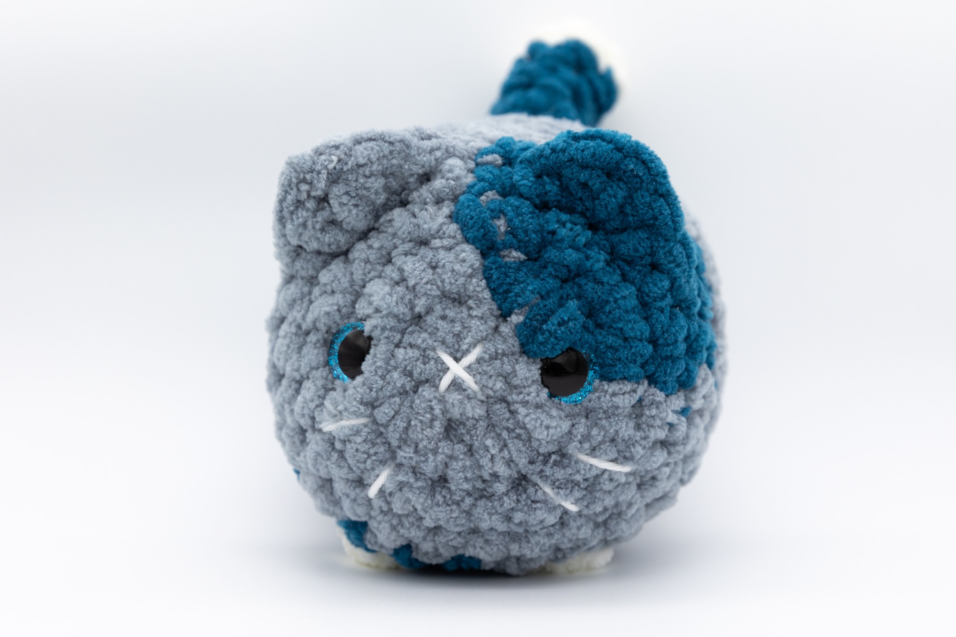 Täysin vegaaninen, pehmeästä mikropolyesterilangasta virkattu kissapehmo Annie Carrawayn ohjeen mukaan. Tiukasti paikallaan pysyvät turvasilmät ja sisäpuolelle solmitut kasvojen yksityiskohdat. Täytteenä vanua.